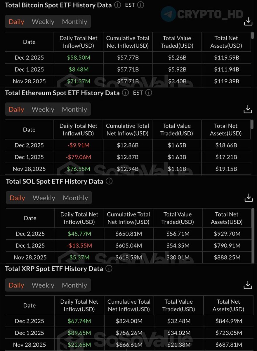 ETF Π·Π° Π²ΡΠ΅ΡΠ°ΡΠ½ΠΈΠΉ Π΄Π΅Π½Ρ: βͺ#BTC = +$58,500,000. βͺ#ETH = -$9,910,000. βͺ#SOL = +$45,770,000. βͺ#XRP = +$67,740,000 (12 Π·Π΅Π»Π΅Π½ΡΡ