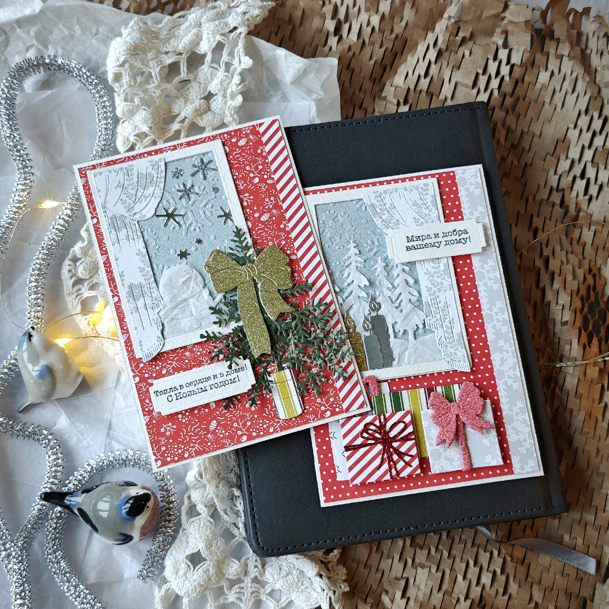 Привет, с вами Надя )) Продолжаю свои сезонные открытки про окна, выпуск номер два! Новогодние! За окном теперь падает пушистый снежок, а дома, за уютными шторами происходит магия и волшебство - наряжается елка и упаковываются подарки )) На окнах "Новые двери в счастье" висят шторы "Театральная гостиная". Модную пихту сделала из сосны "Сосновый бор" и веточки "Под елочкой скакал", трендовый бант взяла из сета "Светлой пасхи". "Снеговик" и "Елки зеленые" вырубила из тишью в несколько сложений - для имитации снежности и пухлости )) На окне зажжены свечи "Хеппи бездей" и лежат подарки "Автомобиль с подарками". Идеально дополнили открытки новогодние штампы с теплыми пожеланиями ))