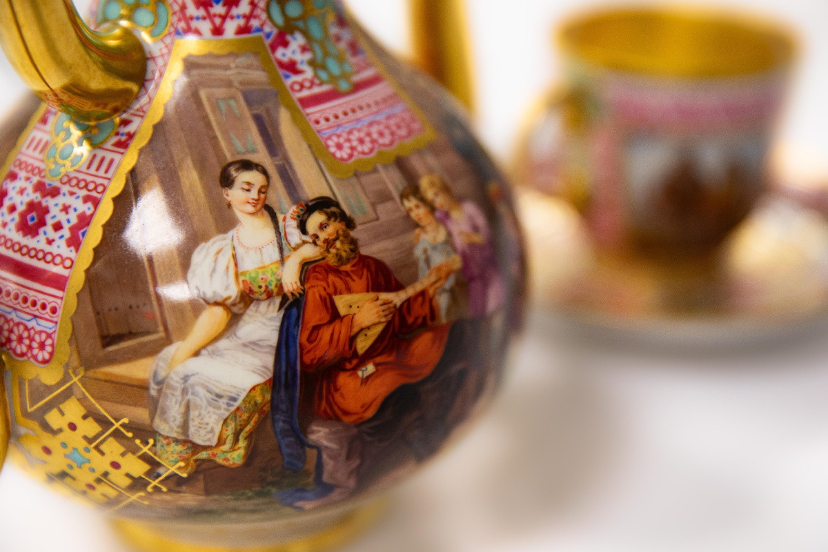 До 27 января 2026 года на выставке «Народы России» в филиале Исторического музея в Туле можно увидеть предметы одноименного сервиза, хранящегося в музее имени Вадима Орлова в Ярославле. Чайник, сахарница, чашка и блюдце изготовлены на Императорском фарфоровом заводе в 1863-1867 гг. Круговая роспись изделий выполнена по изданию Теодора-Христиана Паули — большого этнографического атласа, выход которого в 1862 году был приурочен к празднованию 1000-летия Российского государства. До начала XX века издание «Народы России» оставалось самым полным собранием документальных изображений костюмов и национальных типажей народов и народностей, проживающих на территории Российской империи. Над рисунками работали русские и иностранные художники и граверы. Печать хромолитографий велась в лучших европейских мастерских. Художественные образы, представленные в литографиях, стали образцом для подражания живописцев и мастеров декоративно-прикладного искусства. На чайнике сервиза изображены композиции «Вел