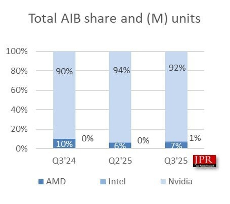 В третьем квартале 2025 года доля дискретных графических решений Intel Arc достигла отметки в 1%. Это позитивная новость, которая увеличивает шансы на сохранение руководством компании, в частности Пэтом Гэлсингером и Лип Бу Таном, курса на развитие дискретной графики Intel. У AMD также наблюдается рост на 1% по сравнению со вторым кварталом текущего года, что кажется хорошим результатом, однако год назад их рыночная доля составляла 10%, а сейчас снизилась до 7%. Стоит напомнить, что если вы уже используете или планируете перейти на GNU/Linux из-за многочисленных проблем с Windows 11, то видеокарты Radeon обеспечивают лучшую совместимость с этой операционной системой. В то же время карты GeForce могут значительно уступать в производительности по сравнению с работой под Windows. @techogid