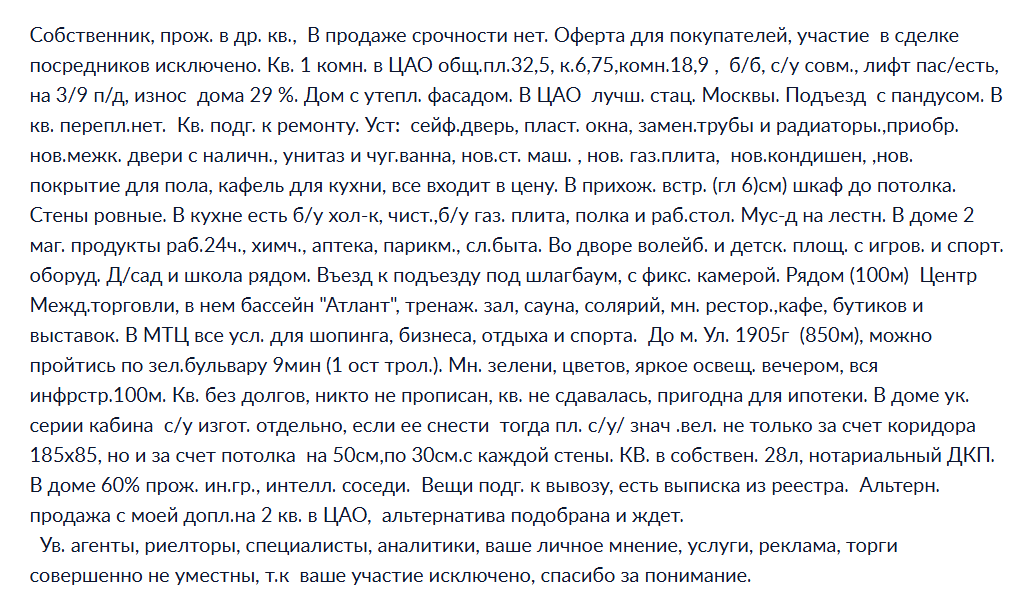 "Перед вами объявление, кажущееся простым лишь на первый взгляд. Его строки, словно тёмные облака осеннего дня, скрывают важные сведения, затуманивая восприятие ясности. Чтение предложения за предложением показывает, что оно представляет собой хаотичный поток сознания, лишённый упорядоченности и последовательности. Читателю приходится продираться через дебри сложных формулировок, стараясь уловить ключевые моменты вроде площади квартиры, её этажности и стоимости.