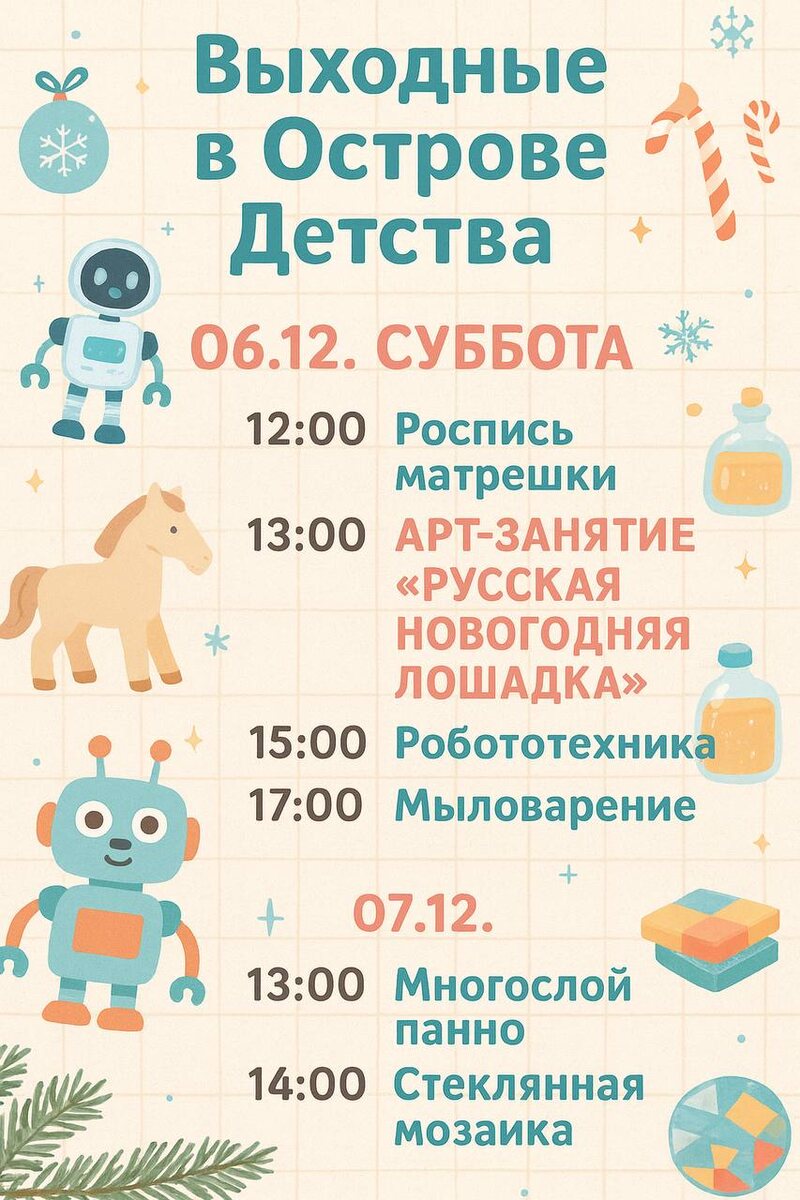 ✨ Волшебство ближе, чем кажется! ✨ Приглашаем вас на новогодние мастер-классы⤵️ Что вас ждёт? — Уютная атмосфера — Пошаговые авторские техники от профессионалов — Готовые творческие шедевры, созданные своими руками 🎄 06.12 — СУББОТА 12:00 — Роспись матрёшки ✨Создайте свою уникальную красавицу в русском стиле — яркую, праздничную, новогоднюю! 13:00 — Арт-занятие «Русская новогодняя лошадка» ✨Волшебный символ праздника, который станет прекрасным украшением дома или подарком. 15:00 — Робототехника ✨Для юных изобретателей: собери своего робота и оживи фантазию! 17:00 — Мыловарение ✨Ароматное, яркое и по-настоящему увлекательный творческий процесс — сделайте праздничное мыло своими руками! ❄️ 07.12 — ВОСКРЕСЕНЬЕ 13:00 — Роспись многослойного панно ✨Объёмная зимняя картина, которая подарит ощущение сказки и украсит ваш дом. 14:00 — Стеклянная мозаика ✨Соберите чудесную поделку из ярких стеклянных элементов! Забронируйте своё место в мастерской Острова Детства прямо сейчас: 8-916-241-19-1