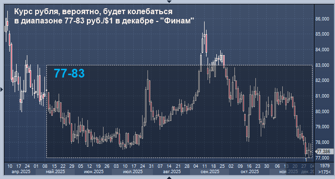 Курс рубля, вероятно, будет колебаться в диапазоне 77-83 руб./$1 в декабре - "Финам" Курс доллара к рублю расчётный, фьючерс, вечный фьючерс и межбанк. Курс евро к рублю расчётный, фьючерс, вечный фьючерс и межбанк. Курс юаня к рублю биржевой, фьючерс, вечный фьючерс и межбанк. Курс валютной пары доллар/рубль, вероятно, будет колебаться в диапазоне 77-83 руб./$1 в текущем месяце, считает аналитик "Финама" Александр Потавин. "Что касается прогноза на декабрь, то все действующие ноябрьские факторы сохранят свое влияние. 19 декабря состоится последнее в 2025 году заседание ЦБ РФ по ключевой ставке. По всей видимости, регулятор может еще раз снизить ставку на 0,5% - до 16% годовых. Но этого будет недостаточно, чтобы ослабить позиции рубля, - отмечает эксперт в комментарии. - В текущем месяце ожидаются сезонно повышенные бюджетные расходы, часть денег из которых может пойти на закупку импорта, что может, как минимум, остановить укрепление рубля. Поэтому мы ожидаем, что пара USD/RUB в декабр