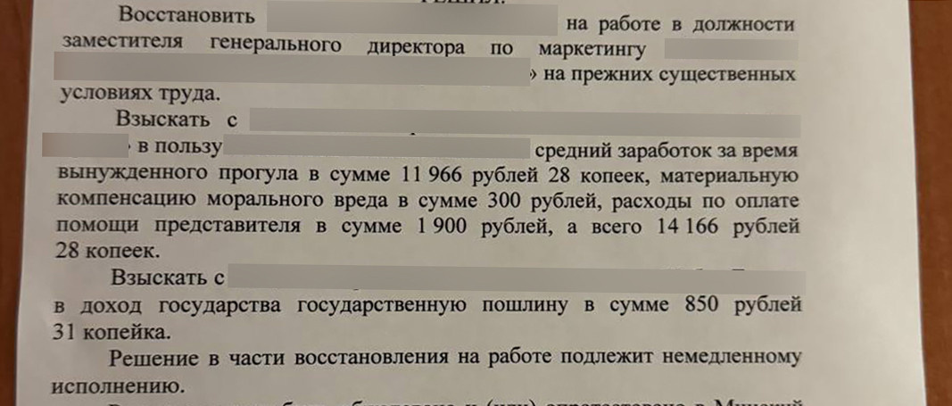 Эту историю мы рассказывали полтора месяца назад: читательница устроилась замгендиректора по маркетингу с зарплатой 7,5 тысячи рублей, но через восемь месяцев компания решила изменить условия труда, и это привело к увольнению работницы. Читательнице предложили оклад 1,8 тысячи рублей, а так как она не согласилась, ее уволили. Работница заподозрила, что ее увольнение из-за несогласия с изменением существенных условий труда незаконно и на самом деле это было скрытое сокращение без выплаты компенсации. Теперь стало известно, чем все закончилось: героиню статьи должны восстановить на работе, а компании следует выплатить ей компенсацию. — По рекомендации вашего юриста обратилась в суд. Он вынес решение о восстановлении на работе, выплате компенсации за время вынужденного прогула, компенсации морального вреда и судебных расходов, — поделилась читательница. Представитель экс-нанимателя в суде требования не признала и просила взыскать с работницы расходы на юридическую помощь — 2100 рублей. В