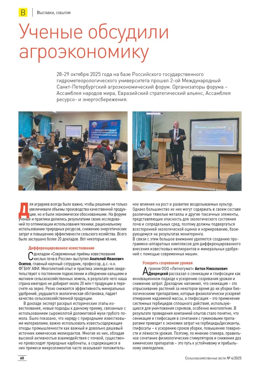 На втором Международном Санкт-Петербургском агроэкономическом форуме ученые и практики делились результатами своих исследований по оптимизации использования техники, рациональному использованию природных ресурсов, снижению энергетических затрат и повышению эффективности сельского хозяйства. Всего было заслушано более 20 докладов. Репортаж с места события здесь: https://agri-news.ru/zhurnal/2025/4-2025/uchenye-obsudili-agroekonomiku/ #АПК#АПКЛО