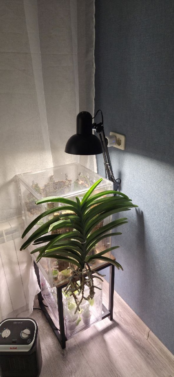 Эксперимент с вандой в ванной закончен. Там не так часто горит свет, как я думала, там жарко. Ванда закуклила все корни. На её место вернуть тоже не могу из-за времени года. Нашла место в районе теплиц. Опрыскивать могу без проблем, корзинку тоже сняла с неё