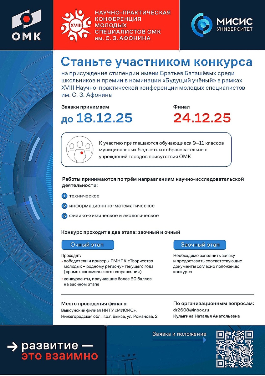 Старшеклассники поборются за стипендии братьев Баташёвых Филиал Университета МИСИС в г. Выкса и Выксунский завод ОМК проводят совместный конкурс на присуждение стипендии им. Братьев Баташевых и премии в номинации «Будущий ученый». К участию приглашаются обучающиеся 9-11 классов муниципальных бюджетных образовательных учреждений городов присутствия ОМК по трем направлениям научно-исследовательской деятельности: — техническое направление, — информационнно-математическое направление, — физико-химическое и экологическое направление. Конкурс проходит в два этапа: заочный и очный. Для участия в заочном этапе необходимо: — собрать пакет документов в соответствии с пунктом 2.3 положения о конкурсе, — заполнить заявку: https://clck.ru/3QXynQ В очный этап проходят победители и призеры РМНПК «Творчество молодых — родному региону» текущего года (кроме экономического направления), а также конкурсанты, получившие более 30 баллов на заочном этапе. Прием заявок продлится до 18 декабря включитель