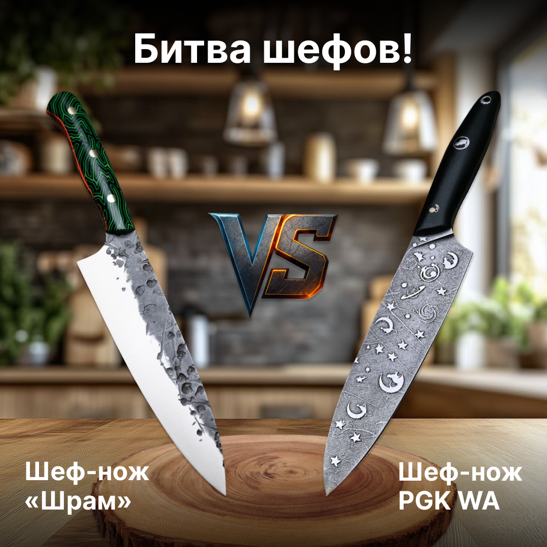 Не только внешний вид определяет выбор хорошего инструмента — также важны материалы, из которых он изготовлен. Устроили для вас небольшое противостояние ножей от известных мастерских. Слева — шеф-нож «Шрам» от КовчегАрт. Характеристики Сталь: AUS10Co Толщина обуха: 3 мм Длина клинка: 175 мм Общая длина: 285 мм Рукоять: авторская микарта Справа — кастомный шеф-нож PGK WA от Волчьего Века. Характеристики Сталь: PGK WA Толщина обуха: 4 мм Длина клинка: 150 мм Общая длина: 260 мм Рукоять: G10, мозаичный пин Оба изделия выполнены достойно и полностью соответствуют своему назначению для идеальной готовки на кухне!