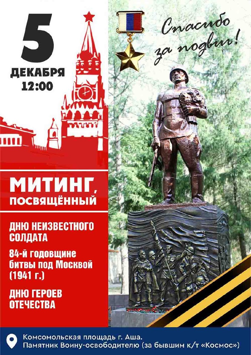 🔻Митинг памяти и героизма пройдёт в Аше 5 декабря 🔻В полдень на Комсомольской площади Аши состоится митинг, посвящённый важным военным датам, увековеченным в истории России