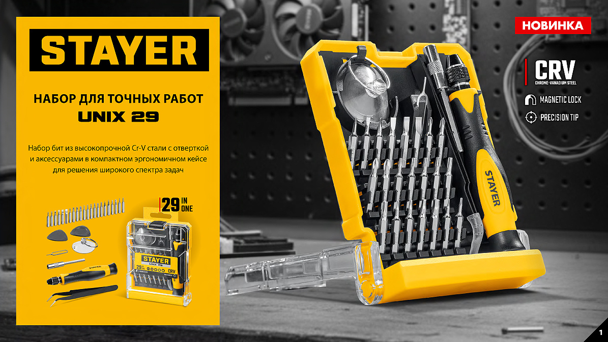 Набор бит из высокопрочной Cr-V стали с отверткой и аксессуарами в компактном эргономичном кейсе для решения широкого спектра задач.