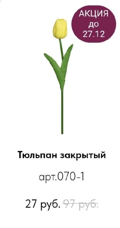 🌸Такого Вы ещё не видели! Скидка более 70% на весенний ассортимент тюльпанов! Чтобы Вы смогли подготовиться заранее и по супер-выгодной цене! 🌷Тюльпан закрытый артикул - 070-1 высота - 34 см. диаметр бутона - 3 см. материал - латекс. 5 расцветок - желтый, оранжевый, белый, бело-розовый, красный. розничная стоимость - 97 руб. 🔥Новая цена для всех - 27 руб.* *Только до 27 декабря 2025г. Минимальный заказ тюльпанов- от 7 шт. Поэтому оставляйте свои заявки под постом в комментарии или в личном сообщении @MariyaCveti_N1 и мы отправим Вашу красоту 🌷 любой транспортной компанией 🚚 по всей России и по миру. #тюльпан #искусственныецветы