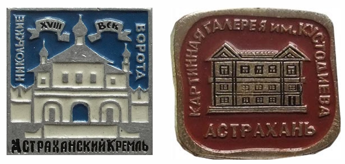 Большое количество значков, посвященных Астрахани, раскрывает перед нами все многообразие достопримечательностей и красот родного города. Чувствуется, что авторы значков – астраханские художники, вложили в них весь свой талант и любовь к родному городу. Достославный Астраханский герб с восточным мечом и короной на лазоревом фоне. Древний и всегда величественный Астраханский Кремль в многоцветии эмалей и техник работы с металлом. Романтическое Лебединое озеро. Великолепный Драматический театр имени Кирова. Всемирно известная Картинная галерея имени Б.М. Кустодиева (ныне – имени П.М. Догадина). Дом-музей И.Н. Ульянова, отца известного всем В. Ленина. Астраханский заповедник – жемчужина Волго-Каспия. Памятник военным морякам, Музей боевой славы – память о грозных годах Войны. Я надеялся, что к юбилею города этот раздел заметно обогатится по количеству и качеству, но как оказалось, увы, ошибся!