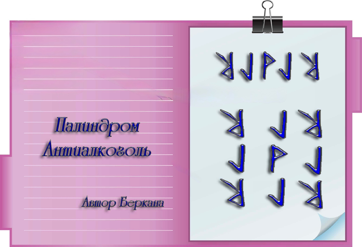 Формула на то, чтобы пьющий человек, выпив спиртное, побежал обниматься с унитазом (иными словами - напустить рвоту при принятии спиртного). Палиндром: Райдо пп - Лагуз пп - Вуньо - Лагуз пп - Райдо пп Вуньо - это радость пьяницы оттого, что добрался до заветной бутылки Лагуз пп - принятая пища вкупе с принятой жидкостью вкупе с принятым алкаголем поворачиваются вспять и начинают искать путь наружу Райдо пп - "приятный" процесс опорожнения желудка. Виса: Мужу, слабому до хмеля, Не сидеть на лавке чинно, Опрокидывая кружки Словно конунг из похода.... Все питье наружу выйдет! Наизнанку повернется, Каждый раз такое будет, Коль хмельное в рот попало! Можно еще по краям поставить Вуньо пп - дабы впредь неповадно было. Можно усилить формулу: Райдо пп - Лагуз пп - Райдо пп Лагуз пп - Вуньо - Лагуз пп Райдо пп - Лагуз пп - Райдо пп И по совету уважаемого afessa - к ножкам перевернутых Райдо пририсовать галочку от Йеры, чтобы получилось по углам Йера с переверн