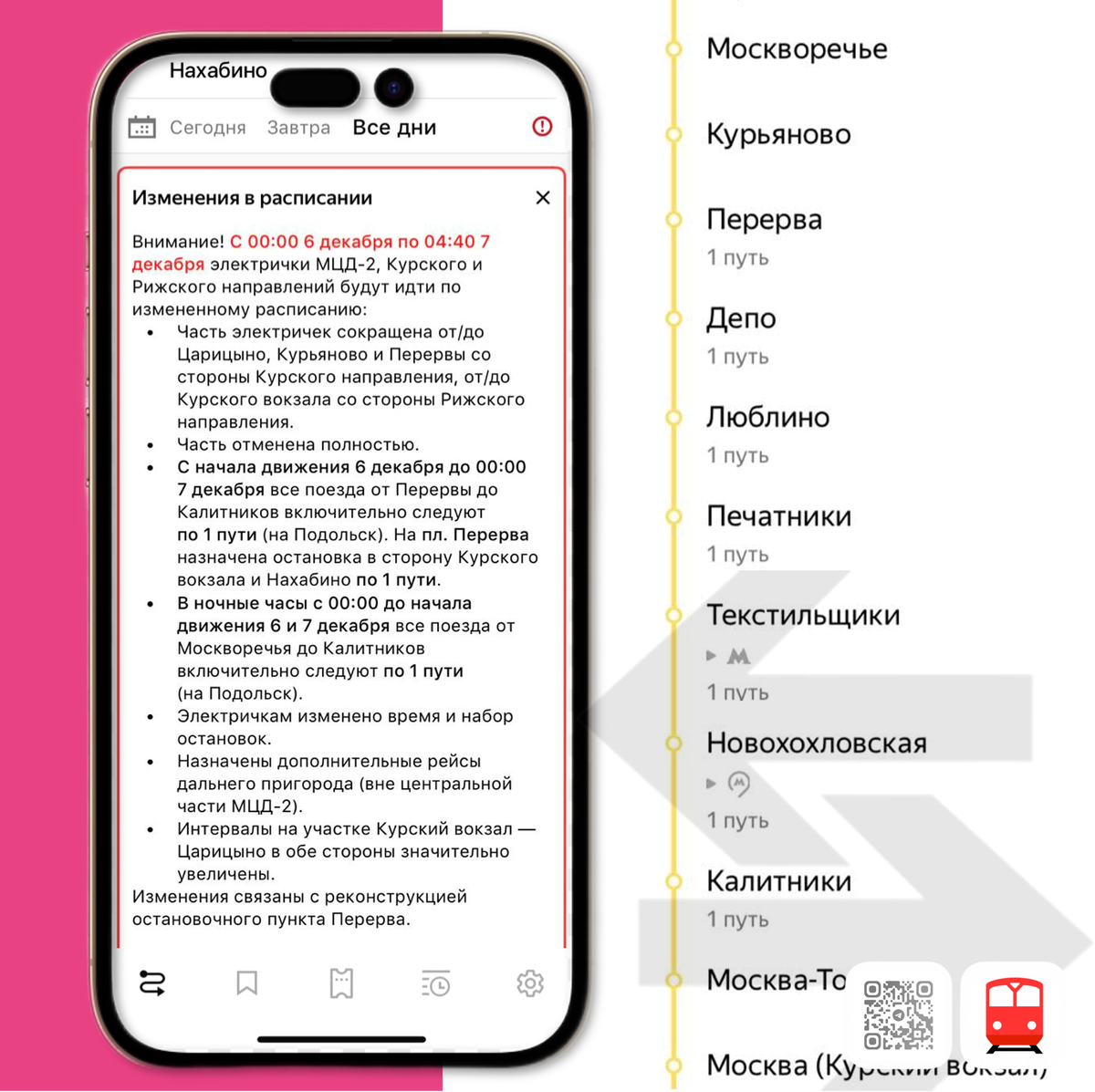 Π°Π±ΠΈΠ½ΠΎ ΠΏΠΎ 1 ΠΏΡΡΠΈ. β‘οΈ Π Π½ΠΎΡΠ½ΡΠ΅ ΡΠ°ΡΡ Ρ 00:00 Π΄ΠΎ Π½Π°ΡΠ°Π»Π° Π΄Π²ΠΈΠΆΠ΅Π½ΠΈΡ 6 ΠΈ 7 Π΄Π΅ΠΊΠ°Π±ΡΡ Π²ΡΠ΅ ΠΏΠΎΠ΅Π·Π΄Π° ΠΎΡ ΠΠΎΡΠΊΠ²ΠΎΡΠ΅ΡΡΡ Π΄ΠΎ ΠΠ°Π»ΠΈΡΠ½ΠΈΠΊΠΎΠ² Π²ΠΊΠ»ΡΡΠΈΡΠ΅Π»ΡΠ½ΠΎ ΡΠ»Π΅Π΄ΡΡΡ ΠΏΠΎ 1 ΠΏΡΡΠΈ (Π½Π° ΠΠΎΠ΄ΠΎΠ»ΡΡΠΊ). β‘οΈ ΠΠ»Π΅ΠΊΡΡΠΈΡΠΊΠ°ΠΌ ΠΈΠ·ΠΌΠ΅Π½Π΅Π½ΠΎ Π²ΡΠ΅ΠΌΡ ΠΈ Π½Π°Π±ΠΎΡ ΠΎΡΡΠ°Π½ΠΎΠ²ΠΎΠΊ. β‘οΈ ΠΠ°Π·Π½Π°ΡΠ΅Π½Ρ Π΄ΠΎΠΏΠΎΠ»Π½ΠΈΡΠ΅Π»ΡΠ½ΡΠ΅ ΡΠ΅ΠΉΡΡ Π΄Π°Π»ΡΠ½Π΅Π³ΠΎ ΠΏΡΠΈΠ³ΠΎΡΠΎΠ΄Π° (Π²Π½Π΅ ΡΠ΅Π½ΡΡΠ°Π»ΡΠ½ΠΎΠΉ ΡΠ°ΡΡΠΈ ΠΠ¦Π-2). β‘οΈ ΠΠ½ΡΠ΅ΡΠ²Π°Π»Ρ Π½Π° ΡΡΠ°ΡΡΠΊΠ΅ ΠΡΡΡΠΊΠΈΠΉ Π²ΠΎΠΊΠ·Π°Π» β Π¦Π°ΡΠΈΡΡΠ½ΠΎ Π² ΠΎΠ±Π΅ ΡΡΠΎΡΠΎΠ½Ρ Π·Π½Π°ΡΠΈΡΠ΅Π»ΡΠ½ΠΎ ΡΠ²Π΅Π»ΠΈΡΠ΅Π½Ρ. ΠΠ·ΠΌΠ΅Π½Π΅Π½ΠΈΡ ΡΠ²ΡΠ·Π°Π½Ρ Ρ ΡΠ΅ΠΊΠΎΠ½ΡΡΡΡΠΊΡΠΈΠ΅ΠΉ ΠΎΡΡΠ°Π½ΠΎΠ²ΠΎΡΠ½ΠΎΠ³ΠΎ ΠΏΡΠ½ΠΊΡΠ° ΠΠ΅ΡΠ΅ΡΠ²Π°. * ΠΠΎ ΠΌΠ΅ΡΠ΅ ΠΏΠΎΠ»ΡΡΠ΅Π½ΠΈΡ ΠΈΠ½ΡΠΎΡΠΌΠ°ΡΠΈΡ ΠΎΡ ΠΏΠ΅ΡΠ΅Π²ΠΎΠ·ΡΠΈΠΊΠ°