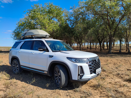 Отдельно отмечу, что эти дороги — не бездорожье, это дороги V категории. Поездка по таким маршрутам сразу обнаруживает все скрипы и слабые места автомобиля. Если говорить о Changan CS95, то он продемонстрировал отличную жёсткость кузова. Это было особенно заметно, так как наша машина была полностью загружена. Хорошо ощущалось на неровностях грунтовки, а также при ранее описанном эпизоде с диагональным вывешиванием нагруженной машины на Ахтубе. Движение по сильно неровной дороге подчёркивает отличную геометрию автомобиля даже при высоких нагрузках.