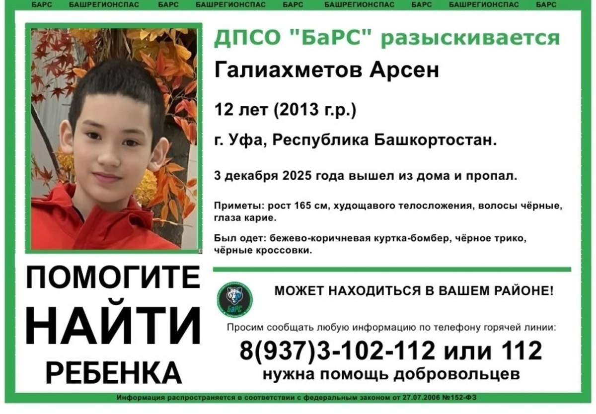 В Уфе объявили о поисках 12-летнего мальчика Арсена Галиахметова. Он внезапно исчез из дома, никто не знает, что случилось. Стало известно, что 3 декабря 2025 года он вышел из дома и ушел в неизвестном направлении. Родители, друзья, знакомые, одноклассники - никто не знает, где он может быть. Приметы мальчика: рост 165 см, худощавый, волосы черные, глаза карие. Был одет в куртку-бомбер коричневого цвета, трико и кроссовки темного цвета, сообщает поисковый отряд "Башрегионспас".