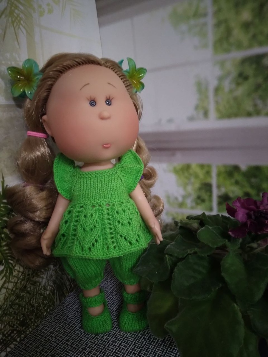 Привет всем! У нас зимой не пахнет, и раньше конца декабря не ожидается. Знаете, как наши предки предсказывали день, когда снег ляжет окончательно в средней полосе России? Я эту примету помню с детства. Надо от дня, когда выпал самый первый снег отсчитать сорок дней. Вот тогда и ляжет, то есть больше уже не растает. Я посчитала, у меня получилось где-то 25 декабря. Проверим?) А пока на улице все темно и уныло, предлагаю полюбоваться новыми фоточками с нашими любимыми куколками. Во-первых у меня связался вот такой комплектик для Мии 30 см. Кстати, почему все пишут, что 30? Я меряла, у меня не больше 28-ми выходит. В общем, Туничка связана по мастер-классу Lara Tvix Dool. Но у нее платье, а я решила связать туничку - просто не довязала один фрагмент на юбке. А пышные штанишки посчитала и связала сама. Туфельки с канала "Мое хобби. Елена". В общем, с мира по нитке, Булочке комплект! Следующая вещичка - топик с узором "Паучки". Я его уже показывала на Мии, но там он с шортами смотрелся уж
