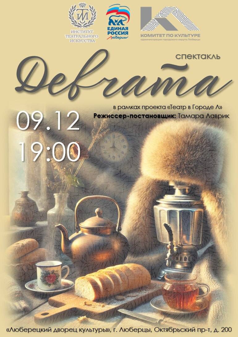 🎭 Люберецкое местное отделение Партии «Единая Россия» приглашает вас на очередной спектакль в рамках уникального культурного проекта «Театр в Городе Л»! В декабрьской афише - спектакль «Девчата» в постановке Тамары Лаврик (Мастерская М.А. Голубкиной) "Девчата" — это трогательная и романтическая история о жизни и любви пяти разных женщин, работающих на лесозаготовках в отдалённом районе. У каждой своя история любви, своя боль, которая раскрывается на протяжении всего спектакля. В сибирский поселок приехала юная повариха Тося Кислицына — наивная и бойкая девчонка. Она каждому стремится помочь. И работая в поселке, она обретает свою первую любовь, которая объединяет девчат: дерзкую и язвительную Анфису, добрую и мудрую Веру, влюбленную и легкую Катю, трудолюбивую и заботливую Надю. Эта история никого не оставит равнодушным, она затрагивает глубинные чувства между людьми, и будет знакома каждому! 📅09 декабря ⏰19:00 🤩Люберецкий дворец культуры Вход на спектакль — свободный! Ждем в