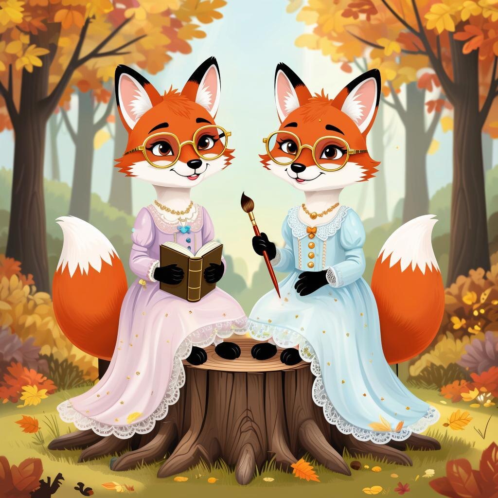 Лили, пыхтя и охая, пробиралась сквозь густую траву. Вдруг, прямо на тропинке, она увидела двух лисиц. Те уселись на пеньке, нарядно разодетые в разноцветные платки и очки с золотой оправой.