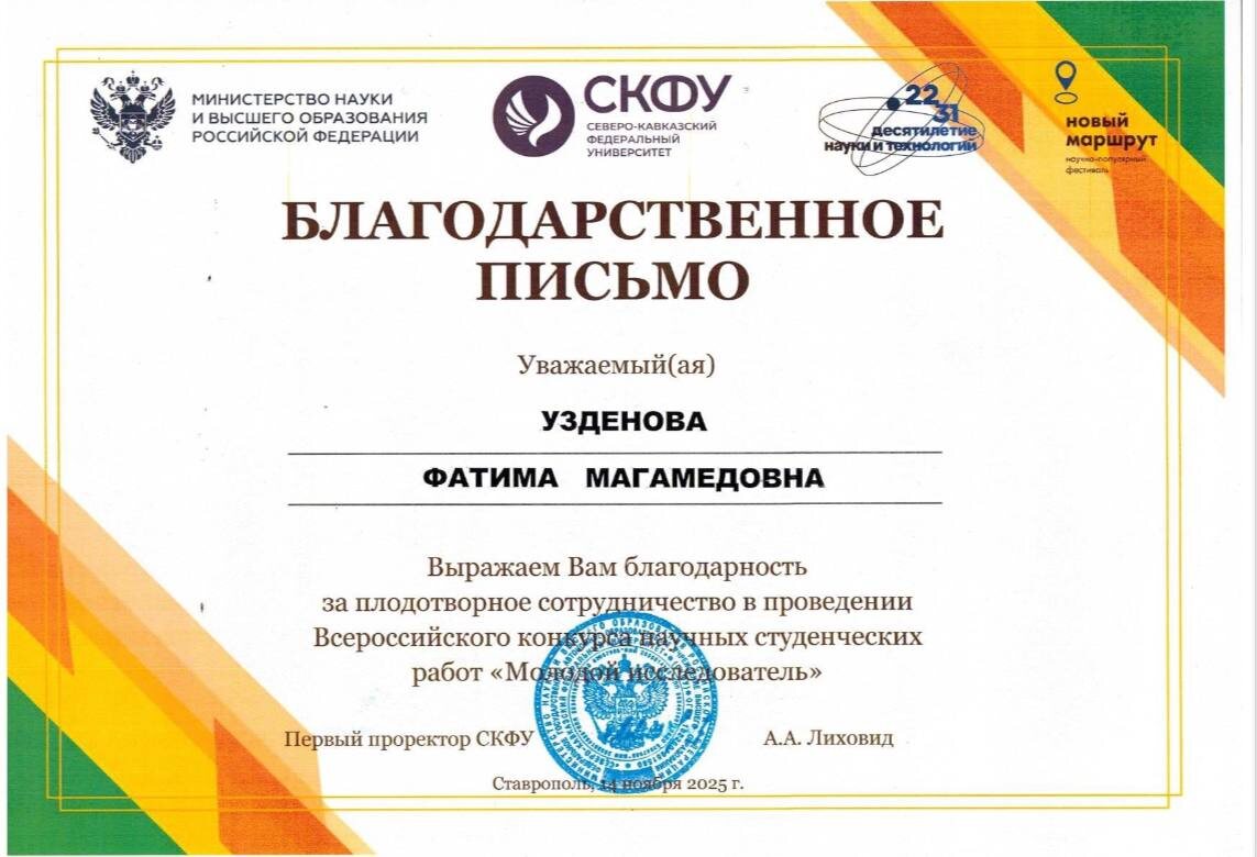 💛 Студент СКГА призер «Молодой исследователь» Обучающаяся первого курса Института экономики и управления Северо-Кавказской государственной академии Добагова Дарина достойно представила нашу академию на Всероссийском конкурсе научных студенческих работ «Молодой исследователь» для студентов высших учебных заведений и стала призером, получив диплом III степени. По итогам конкурса благодарственным письмом была отмечена ее научный руководитель – Узденова Фатима Магамедовна, кандидат экономических наук, доцент, заведующая кафедрой «Бухгалтерский учет». «Конкурс ежегодно объединяет молодых исследователей со всей страны и служит важной площадкой для развития научного потенциала студентов» Мероприятие реализуется при поддержке Минобрнауки России в рамках Десятилетия науки и технологий, объявленного Указом Президента Российской Федерации от 25 апреля 2022 г. № 231. 〽️Поздравляем Дарину и ее научного руководителя с заслуженными наградами! Желаем дальнейших успехов, ярких инициатив и новых