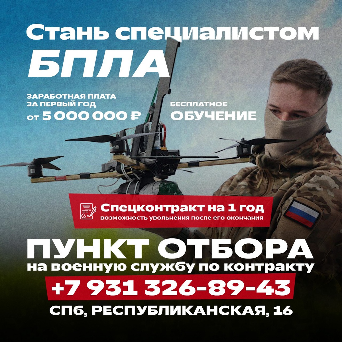 Получите востребованную специальность и заработайте 5 000 000 рублей за один год Приглашаем на службу в войска беспилотных систем в зоне СВО на должности оператор БПЛА или инженер-техник. Специальный срочный контракт — только 1 год (с возможностью увольнения после его окончания). Бесплатное обучение с нуля всем необходимым навыкам сроком от двух месяцев сразу после заключения контракта. Заработная плата за первый год от 5 000 000 рублей и более (минимальная гарантированная сумма, без учета выплат за боевые заслуги). 2 500 000 — единовременная выплата сразу, далее от 210 тысяч в месяц. Требования к кандидатам: • гражданство РФ • мужчины от 18 до 45 лет • категория здоровья А или Б • отсутствие судимости Оставить заявку и узнать подробности можно по телефону 89313268943 или в личных сообщениях группы: https://vk.com/krgv_work