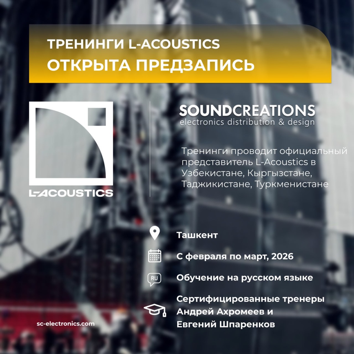 Открыта предварительная запись на тренинги L-Acoustics Компания Sound Creations приглашает инженеров и специалистов пройти официальное обучение по работе с системам L-Acoustics в 2026 году! Это — уникальная возможность получить международно признанную квалификацию и повысить практические навыки работы с профессиональным звуковым оборудованием L-Acoustics, мирового лидера в области звукоусиления. Локация: Ташкент Период проведения: февраль – март 2026 Ждём специалистов из Узбекистана, Кыргызстана и всех, кто стремится грамотно и уверенно работать с L-Acoustics. Программа охватывает все уровни подготовки: от базового курса System Technician до продвинутых модулей по пространственному звуку L-ISA. Все тренинги проводят сертифицированные тренеры L-Acoustics с многолетним опытом. Подробнее о программе и регистрация — по ссылке #lacoustics #обучение