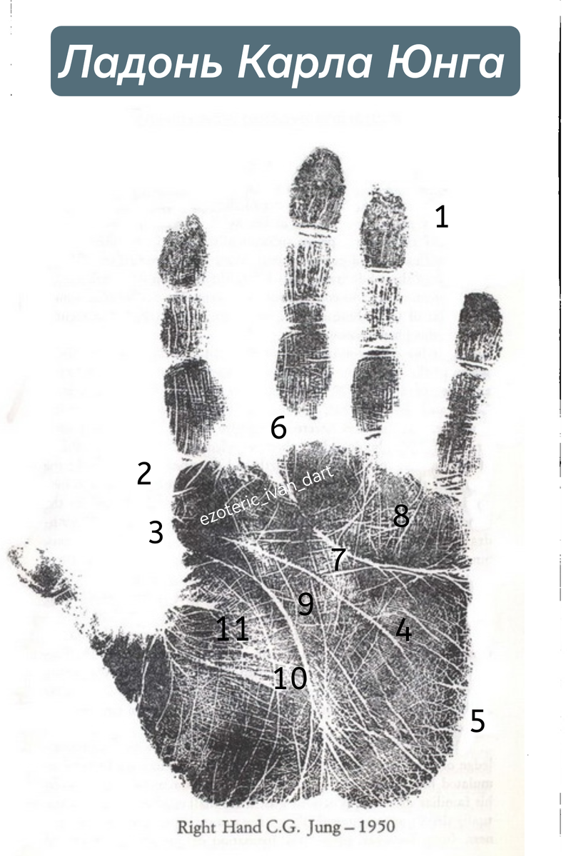 РАЗБОР РУКИ КАРЛА ЮНГА. Разберем ладонь Карла Юнга по основным признакам: 1. Длинный безымянный палец. Палец Солнца связан с мужской солнечной энергией, мужскими качествами и проявлениями. Длинный безымянный говорит о мужественности Карла, его харизме и обаянии. Солнце усиливало социальную активность, давало желание сделать что-то важное и полезное для общества. В Индии палец Аполлона связан с Духовной Силой, саморазвитием и познанием Истин. 2. Крупный холм Юпитера. Данная планета наделяла его большими амбициями, стремлением к реализации своего потенциала. Безусловно, Юпитер даёт стремление к знаниям и авторитету. И, несомненно, Карл Густав Юнг был признанным лидером в мире психологии. Юпитер даёт стремление к власти, либо к Духовности. Как видим, здесь планета направила Карла в стезю Духовных познаний. Наличие вертикали на холме тоже говорит о позитивной энергии планеты. 3. Линия Ума начинается с Холма Юпитера. Это указывает на важность познания в жизни человека. Воздушная линия
