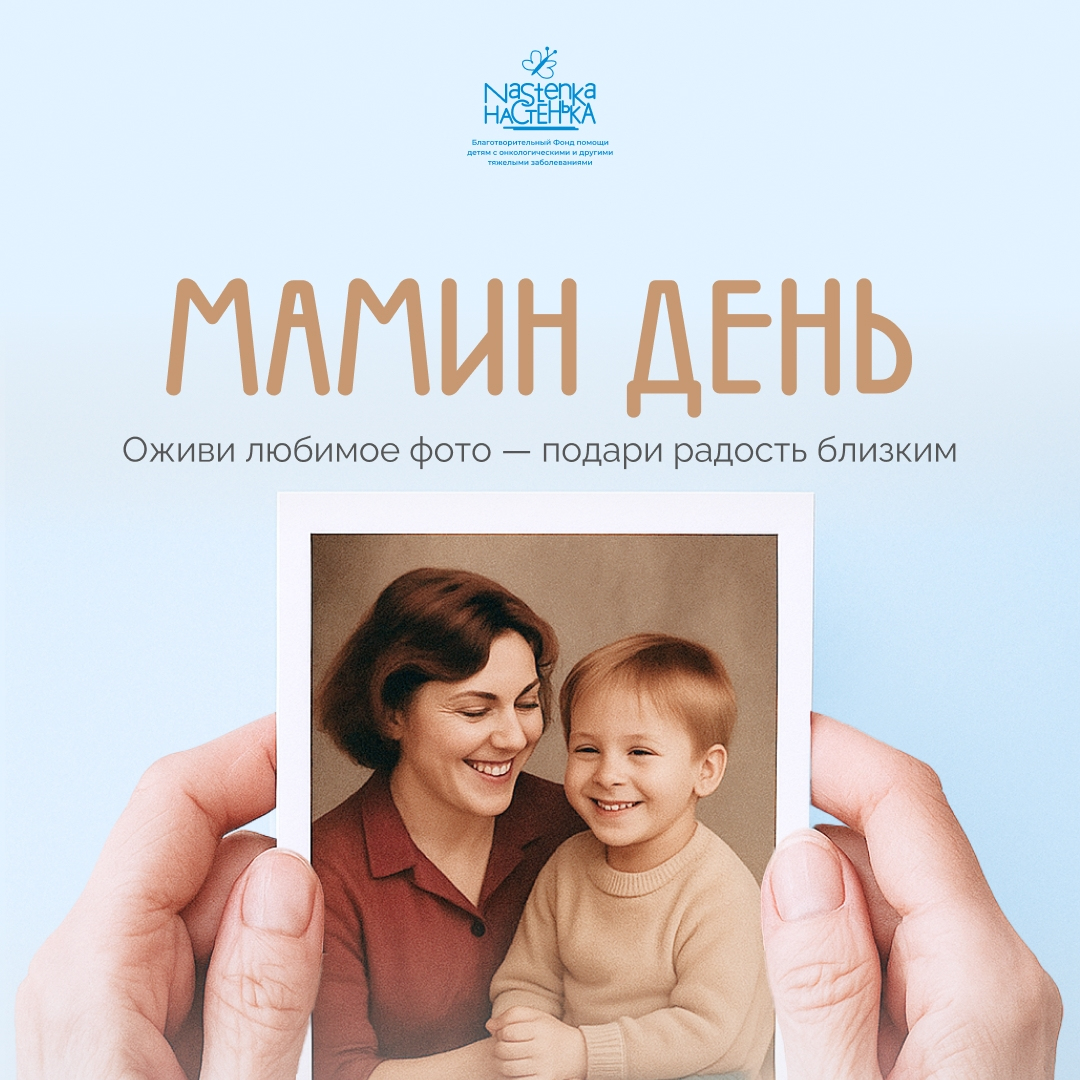 К Международному Дню матери команда фонда «Настенька» выпустила специальный лендинг акции «Мамин день». Каждый может оживить фотографии из семейного архива при помощи новых технологий и отправить близкому человеку. Теплые воспоминания напомнят о счастливых моментах вместе. Акция продлится до 15 декабря. Все собранные средства будут направлены на помощь тяжелобольным детям. «Мамин день» - акция в поддержку всех мам, которые сейчас борются за здоровье своих детей. Самое страшное для родителей, когда их ребенок болеет. Это перечеркивает все, меняется жизнь семьи. Если бы не мама, то детям с тяжелыми заболеваниями было бы очень трудно пережить непростое время борьбы с болезнью. Именно мама поддерживает, не дает опустить руки, отчаяться. Фото: предоставлено БФ "Настенька" Как принять участие в акции: Зайти на сайт акции. Загрузить фото в форматах jpeg или png размером до 5 Мб. Указать сумму пожертвования. Получить на указанную в платежной форме электронную почту ссылку на готовое видео с о