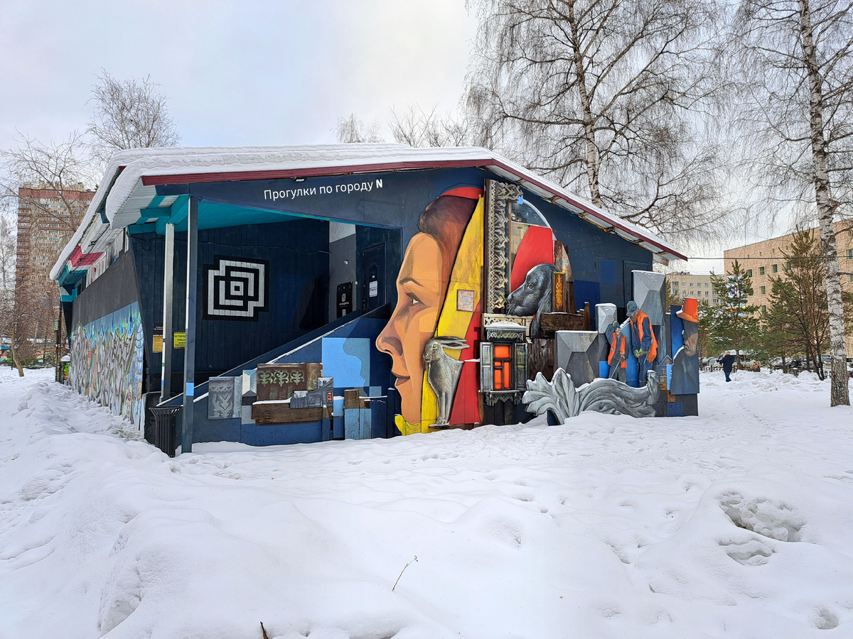 Это «Сибирский ассамбляж» — загадочный арт-коллаж от томских художников Ильи Маломощенко и Матвея Фатеева. Присмотритесь: вот бетон и работники дорожных служб, а рядом — резные деревянные наличники, из которых выглядывает собака. Где-то тут прячется заяц, а в центре — девушка в платке-скафандре. Вы только посмотрите на окошко! Создается впечатление, будто бы там и правда горит свет…🕯