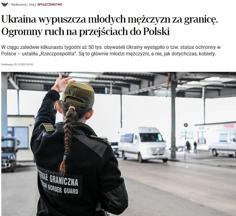 В Польшу хлынули молодые украинцы. Это становится серьезным вызовом для польской безопасности, особенно после недавних диверсий, — пишет Rzeczpospolita. По данным польских пограничников, с 29 августа въехало более 120 тыс. молодых мужчин 18–22 лет, не считая женщин, детей и более возрастных мужчин. Также Варшава неожиданно заявила, что «украинские мужчины плохо интегрируются в польское общество» и чаще остальных совершают преступления. Только за первые полгода задержано более 5 тыс. украинцев, в том числе двум предъявлены обвинения за диверсии на железной дороге. 💯 Кроме того, замдиректора Польского центра исследований трансграничной безопасности опасается, что после войны волна "травмированных и агрессивных" украинцев с непроверенной биографией создаст риск для социально-политической стабильности. Невольфович