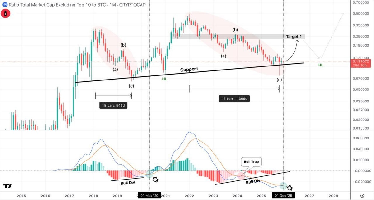 #OTHERSBTC 1M график | TA Изображение Это изображение чрезвычайно позитивно для #Altcoins Несмотря на обвал 10 октября, #OTHERSBTC держало линию поддержки! + Есть позитивная дивергенция на гистограмме MACD & MACD формирует позитивный кросс 👀 👉 Продажа #Alts здесь внизу 4-летнего падения - ошибка. Пока поддержка держится, нас ждет 2-3-летняя макро-восходящая тенденция на #Alts по отношению к #BTC 📈