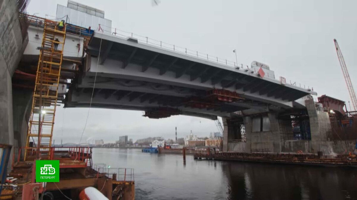 [ Смотреть видео на сайте НТВ ] Почти двое суток понадобилось рабочим, чтобы установить первый разводной пролет Большого Смоленского моста. Конструкцию сначала собрали на берегу, затем с помощью катамарана доставили в створ между пятой и шестой опорами. Как сообщил представитель генподрядчика, сложность работ заключалась в том, что в этом месте сильное течение и при подъеме 400-тонной конструкции строители могли ошибиться максимум на 10 сантиметров. Но всё прошло успешно. Накануне Дня мостостроителя объект посетил губернатор города Александр Беглов. Александр Беглов, губернатор Санкт-Петербурга: «Сложное решение. Каждое крыло 400 тонн нужно поднять на 15 метров, установить. Теперь еще одна сложная задача — соединить два пролета». Также представители генподрядчика заявили, что ближайшую весеннюю навигацию переправа встретит с обоими работающими пролетами. Кроме того, Александр Беглов сегодня назвал компанию, которая будет строить мост через Неву для Широтной магистрали скоростного движе