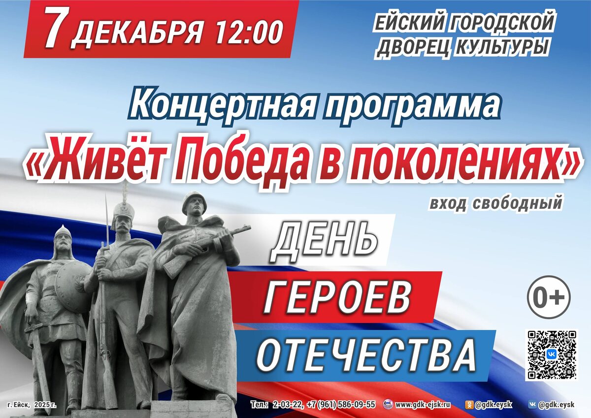 7 декабря в 12:00 состоится концертная программа, посвящённая Дню героев Отечества. Эта памятная дата отмечается в нашей стране ежегодно 9 декабря. Зрителей ждёт встреча с хоровыми, хореографическими и детскими вокальными коллективами Ейского городского центра народной культуры, обладателями Гран-при первого городского конкурса патриотического творчества «Во имя Памяти». День Героев – день гордости России! 🚀 Подписывайтесь: @gdk_ejsk
