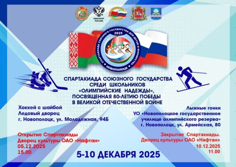 Более 230 юных спортсменов из Беларуси и России соберутся, чтобы побороться за победу в лыжных гонках и хоккее с шайбой С 5 по 10 декабря в белорусском городе Новополоцке состоится Спартакиада Союзного государства среди школьников "Олимпийские надежды", посвященная 80-летию Победы в Великой Отечественной войне. Это уникальная возможность для молодых спортсменов из Беларуси и России показать свои силы, объединяясь в братском союзе и вместе объединяю усилия по сохранения памяти о героическом прошлом.
