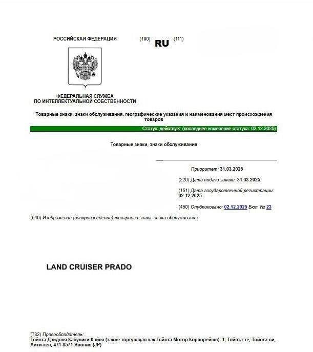 🚘 Toyota зарегистрировала товарный знак Land Cruiser Prado в России