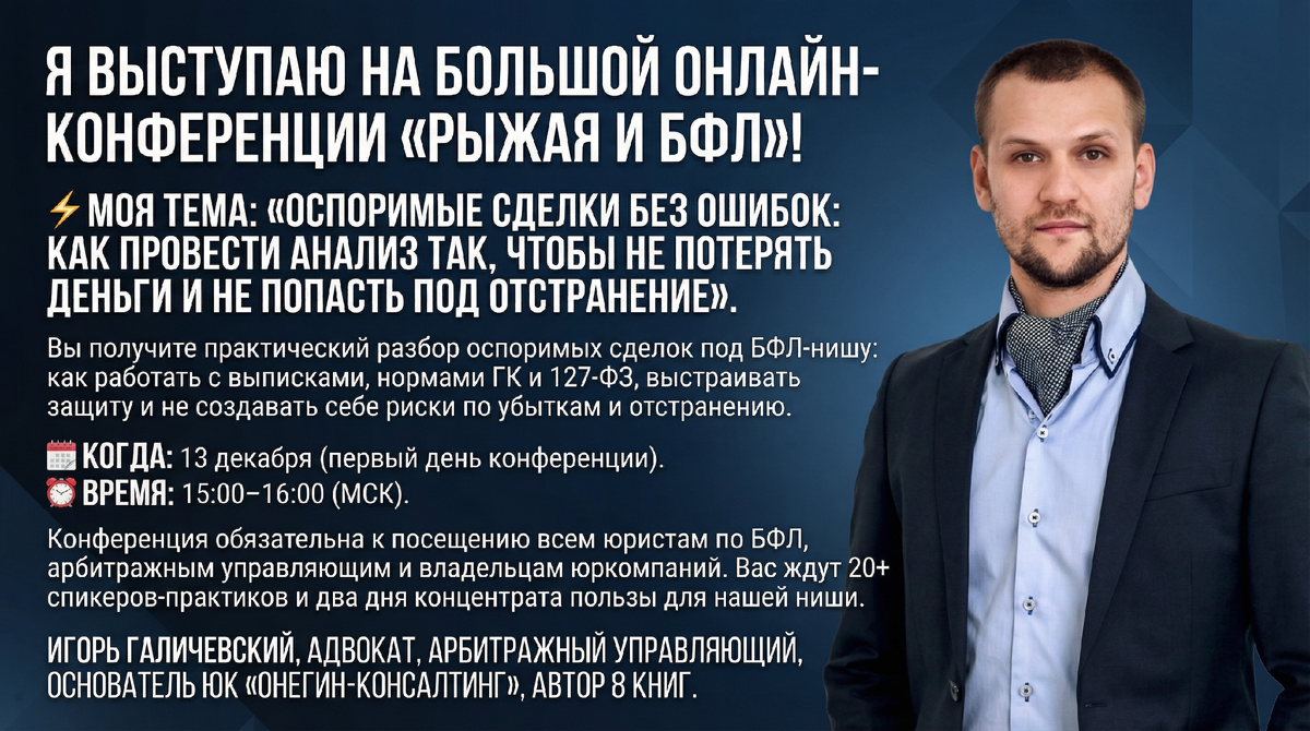 С уважением, Игорь Галичевский, адвокат, арбитражный управляющий, основатель ЮК «Онегин‑Консалтинг», автор 8 книг.