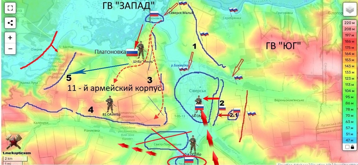 Северск. Финальная агония ВСУ Тут у противника полное фиаско. Рухнула оборона в Свято-Покровское. ВС РФ начали продвигаться в направлении Резниковки вдоль укреплений №4, блокируя их. В это время им в тыл выходят наши части из района Платоновки. Примерно та же история с укреплениями №5, им с запада зашли в тыл и блокировали в районе моста Закотное. схемы и карты