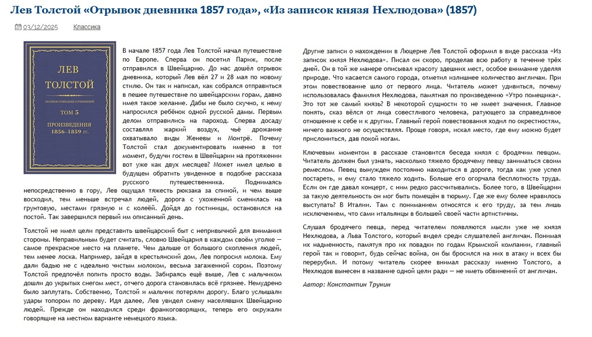 Лев Толстой «Отрывок дневника 1857 года», «Из записок князя Нехлюдова» Критика