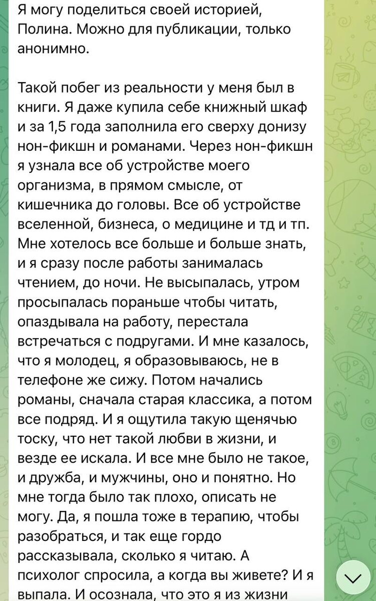 В продолжение поста про эскапизм. Такой историей поделилась подписчица. Спасибо огромное за доверие и вашу искреннюю и очень важную историю. Это хороший реальный и честный пример, того как может выглядеть любое увлечение. Со стороны может казаться, что человек «молодец»: развивается, читает, а не в телефоне сидит. Но суть не в действии, а в его функции: побег это или восстановление? То, что описывает автор, это классический побег в альтернативную реальность. Где не просто узнаёшь новое, а живёшь чужой жизнью, потому что своя кажется слишком сложной, скучной или болезненной. Вопрос терапевта «А когда вы живете?», вроде такой простой, но он стал точкой осознания. Как пробуждающее переживание, о котором говорил Ялом. А я упоминала вот тут. «Это и правда было как наркотик, я чувствовала ломку». Да, можно зависеть не только от веществ, но и от эмоций, красоты, интенсивности переживаний, которых не хватает в реальности. И даже сейчас, когда баланс найден, остаётся ностальгическая тяг