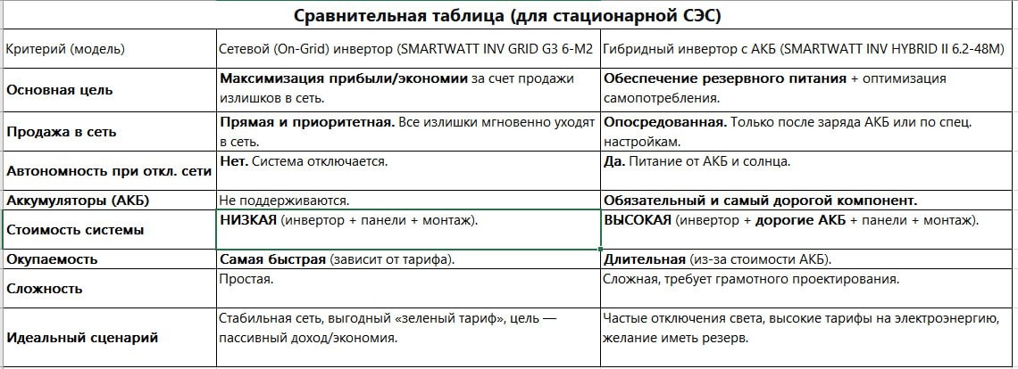 Друзья, всем привет! Как и обещал подробнее рассказать про солнечную электростанцию. Расписал сравнительную таблицу. Чтобы выбрать для себя солнечную электростанцию, нужно понимать, что они есть двух типов "Сетевая", без аварийного резерва - дешевле и "Гибридная" с аварийными резервами (аккумуляторами) - дороже. ☀️ Сетевой vs Гибридный инвертор для дома. Ключевой выбор — это инвертор. От него зависит логика работы и экономика. ⚡️ СЕТЕВОЙ (On-Grid) - SMARTWATT INV GRID G3 6-M2 Принцип: Преобразует ток от панелей в 220В и сразу отдает в дом/сеть. Работает только при наличии внешней сети. Если ваш дом еще не подключили к электросетям, он работать не будет. Плюсы: • Самая высокая экономика. Макс. КПД, низкая цена, быстрая окупаемость. • Идеален для «зеленого тарифа». Все излишки сразу идут на продажу. Минусы: • Нет резерва. При отключении городской сети ваша СЭС тоже выключается, даже если светит солнце. • Накопление невозможно (без доп. оборудования). 🔋 ГИБРИДНЫЙ (Hybrid) - на фото и