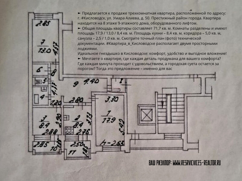 ΠΎΠ΄ΠΈΡΡΡ Π½Π° 8 ΡΡΠ°ΠΆΠ΅ 9-ΡΡΠ°ΠΆΠ½ΠΎΠ³ΠΎ Π΄ΠΎΠΌΠ°, ΠΎΠ±ΠΎΡΡΠ΄ΠΎΠ²Π°Π½Π½ΠΎΠ³ΠΎ Π»ΠΈΡΡΠΎΠΌ. βΊ ΠΠ±ΡΠ°Ρ ΠΏΠ»ΠΎΡΠ°Π΄Ρ ΠΊΠ²Π°ΡΡΠΈΡΡ ΡΠΎΡΡΠ°Π²Π»ΡΠ΅Ρ 71,7 ΠΊΠ². ΠΌ. ΠΠΎΠΌΠ½Π°ΡΡ ΡΠ°Π·Π΄Π΅Π»Π΅Π½Ρ ΠΈ ΠΈΠΌΠ΅ΡΡ ΠΏΠ»ΠΎΡΠ°Π΄Ρ 17,9 / 13,0 / 8,4 ΠΊΠ². ΠΌ. ΠΠ»ΠΎΡΠ°Π΄Ρ ΠΊΡΡ