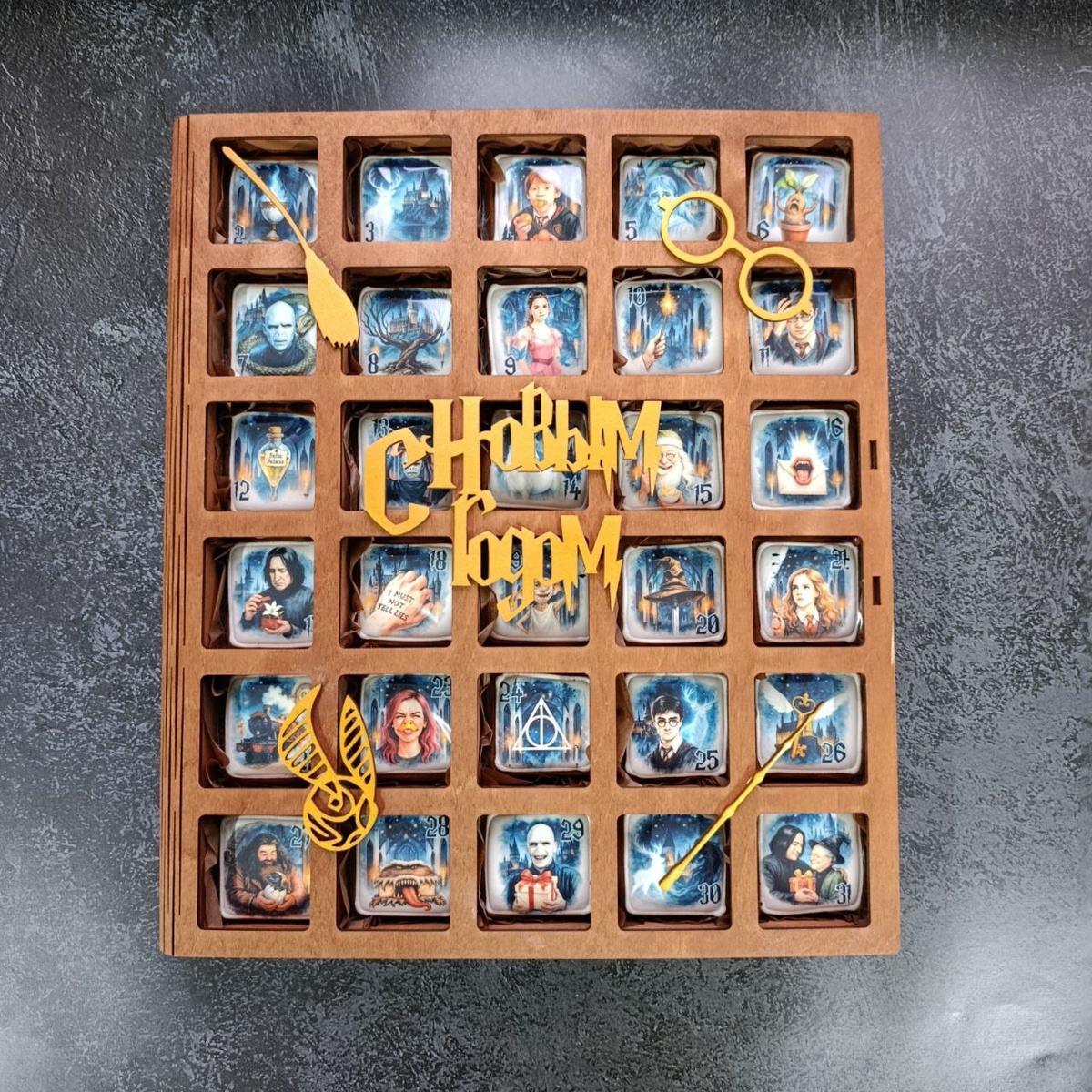 Адвент календарь в деревянной коробке в стиле Гарри Поттера.