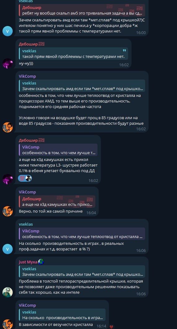 Здесь предлагаю на минуту погрузиться в океан непоределенности, навигацию по которому приходится брать на себя. Во первых, тепло рассчитывается по формуле ватт на метр*кельвин. Значит, чем толще проводник - тем заметнее потеря. Скальпируют ради какраз таки сокращения толщины термоинтерфейса, поскольку заводской припой ложится толстым слоем и часто неровно. С крышкой ситуация несколько иная - она действительно толще для того, чтоб тепло отводилось латерально - то есть, побокам от миниатюрных чиплетов. Это кстати объясняет, почему прямой контакт не возможен без пропиретарного водоблока. Скальп дает выигрышь в ФПС и температурах, открывая новые возможности разгона и настройки процессоров АМД. Скоро на нашем канале выйдет ОГРОМНЫй материал на эту тему