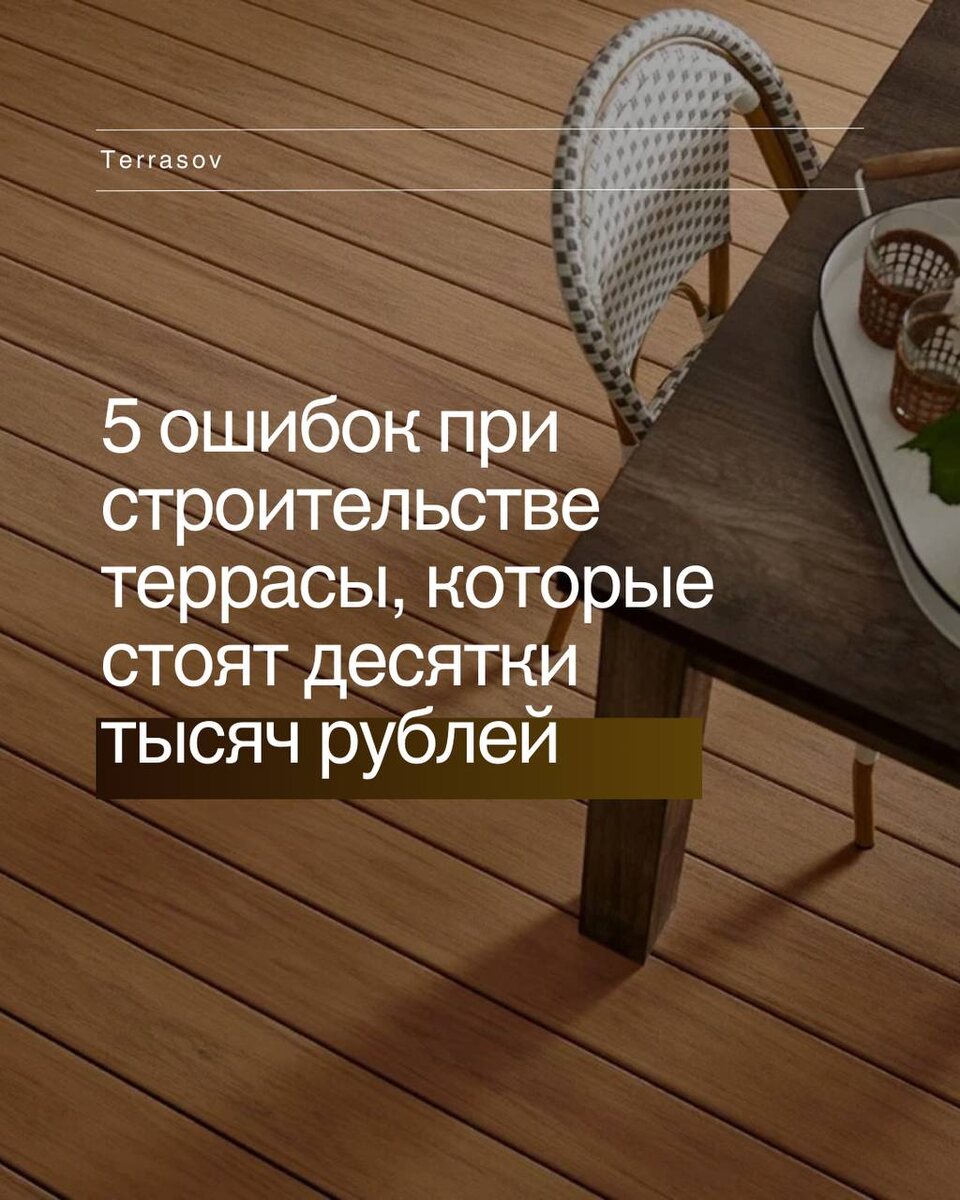 Большинство проблем с террасами появляются не через 5 лет - а уже через первую зиму. И почти всегда причина одна - ошибки на старте. Разбираем 5 самых частых 👇 ❌ 1. Экономия на основании Если основание «играет» - терраса тоже будет играть. Перекосы, скрип, лопнувшие плитки — вопрос времени. ✅ Правильно: жёсткое основание, точная геометрия, выверенные высоты. ❌ 2. Неправильный уклон Вода должна уходить, а не стоять. Без уклона: - лужи - наледь - разрушение материалов ✅ Правильно: инженерный расчёт стока ещё до монтажа покрытия. ❌ 3. «Подберём потом» материалы Часто выбирают красивое - но не предназначенное для улицы. Результат: - выгорает - расслаивается - трескается ✅ Правильно: использовать уличные материалы: ДПК, керамогранит, термодерево. ❌ 4. Монтаж «по наитию» Без уровней. Без лазера. Без системы. ✅ У нас каждый объект проходит: - лазерную разметку - точный уровень - расчёт нагрузок Именно поэтому террасы Terrasov выглядят «ровно как в 3D». ❌ 5. Делать без проект