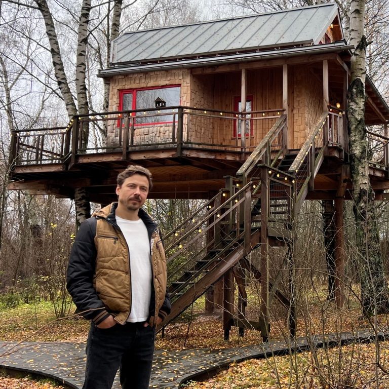 На берегу озера я спроектировал небольшой дом, а Вика наполнила его интерьер интересными деталями. Около года мы просто ничего не делали. Наслаждались природой и наблюдали за растущей дочкой. Вскоре посетила идея создать гостевой дом для друзей и кабинет для себя. А чтобы открывался вид на озеро, его нужно было поднять на деревья. И только в этот момент я вспомнил о своей мечте.