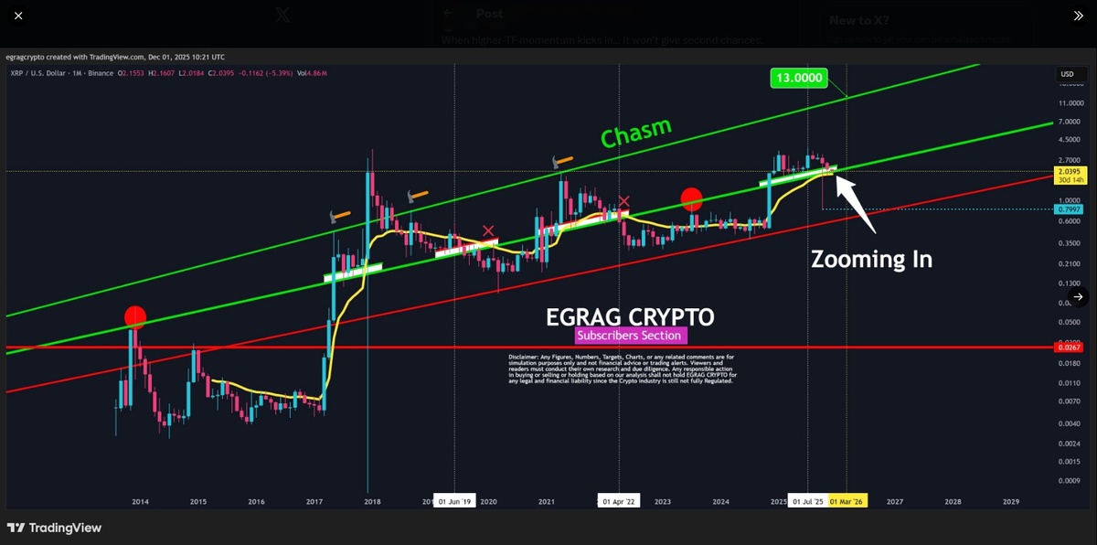 🎯 Прогноз XRP на 3-6 месяцев: Аналитик предсказывает рост до $13 📈 XRP хоть и показал снижение на недельном графике, но сохраняет бычий импульс на месячном таймфрейме, оставаясь выше 21-дневной EMA. Аналитик Egrag Crypto прогнозирует потенциал роста до $9-$13 в течение 3-6 месяцев с вероятностью 55-65%. 📊 Ключевые моменты: - Все краткосрочные таймфреймы (4H, 1D, 3D, 5D, 1W, 2W) торгуются ниже 21-дневной EMA. - Месячный график (1M) демонстрирует бычий тренд, удерживаясь выше 21-дневной EMA. - Выпуск 1 миллиарда XRP из эскроу Ripple в декабре (две транзакции по 500 миллионов XRP). - Другие аналитики прогнозируют $4 к Q1 2026 на фоне запуска Ripple RLUSD в Японии и притока $756 млн в спотовые XRP-ETF. ⚠️ Риски: Краткосрочное давление на продажу может продолжиться, а выпуск из эскроу может увеличить предложение на рынке. Горизонт: Среднесрочно