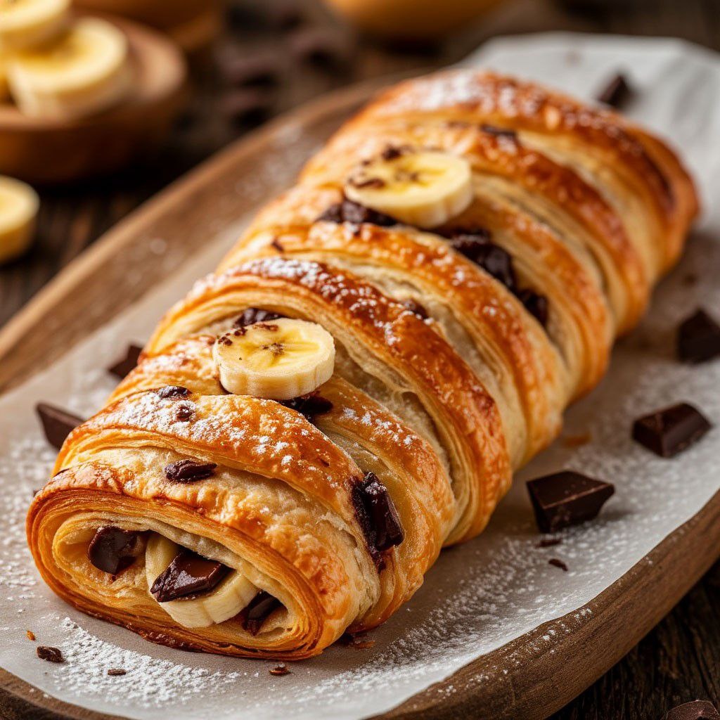 📖 Ингредиенты: - Банан - 3 шт. - Бездрожжевое слоеное тесто - уп. - Шоколад - 1 плитка - Яйцо - 1 шт. 🧑🏻🍳 Приготовление: 1. Банан разрезать пополам , потом каждую половинку ещё раз пополам. 2. Слоеное тесто немного присыпать мукой, раскатать, и нарезать на полоски. 3. Берём кусочек банана, на него кладём пару долек шоколада. 4. Заматываем плотно слоенным тестом. 5. Смазываем яйцом. 6. Отправляем в разогретую духовку до 180 градусов на 25-30 минут.