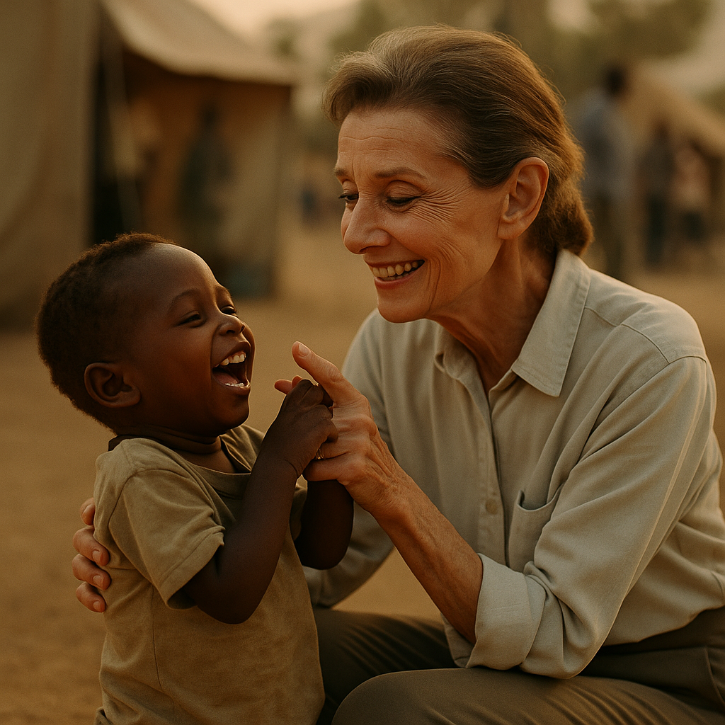 Поздний вечер. Пыльная дорога, серая палатка, лампа на длинном проводе. Одри в простой рубашке сидит на корточках рядом с ребёнком, который сначала стесняется, а потом тянет к ней руки. Она что-то шепчет ему, смешит, показывает, как складывать пальцами смешную фигурку. Рядом лежит пластиковое ведёрко, вдалеке слышны голоса работников гуманитарной миссии. Камеры нет. Красной дорожки нет. Есть женщина, которая давно могла бы спать в роскошном отеле, но почему-то снова в поездке, в простой одежде и с чужим ребёнком на руках.