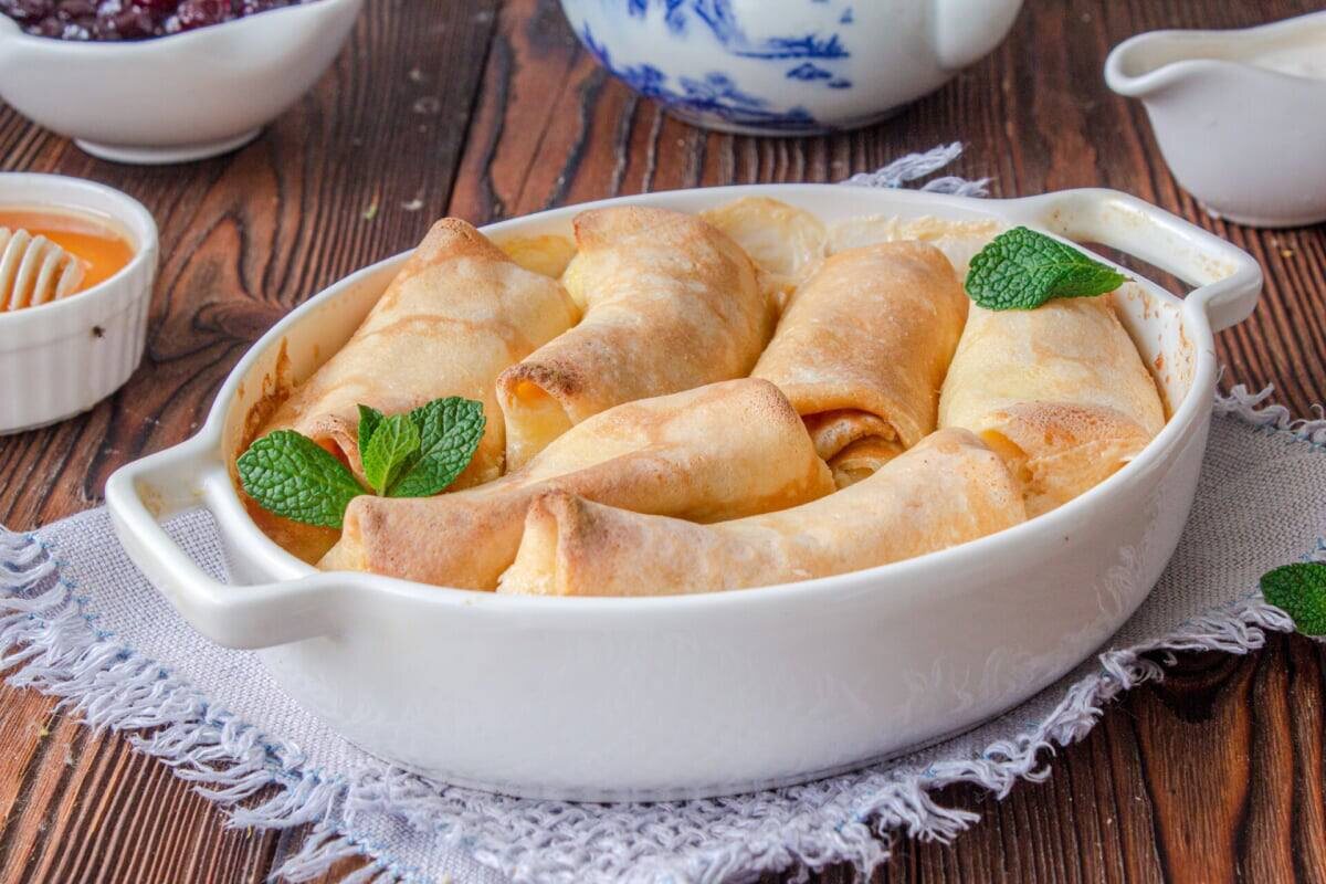 📖 Ингредиенты: для блинов: - Яйцо - 1 шт. - Молоко - 500 мл. - Мука - 1 стакан - Соль - щепотка - Сахар - 2 ст. л. - Растительное масло - 1 ст. л. для начинки: - Творог - 170 г. - Сахар - 2 ст. л. - Яйцо - 1 ш. - Мак - 1/2 ст. о. для глазури: - Сливочное масло - 20 г. - Сахар - 1 ч. л. 🧑🏻🍳 Приготовление: 1. Взбейте в глубокой миске яйцо с солью и сахаром, влейте 1 стакан теплого молока. 2. Просейте всю муку и замешайте тесто чуть гуще, чем для оладьев, разбавьте его оставшимся количеством молока, добавьте растительное масло и выпекай блины. 3. Для начинки пробейте блендером творог с яйцом и сахаром, добавьте предварительно замоченный мак и перемешайте. 4. Положите начинку на блины и сверните небольшие рулетики, смажьте растопленным сливочным маслом и посыпьте сахаром. 5. Отправьте в духовку на 15 минут при 220С.