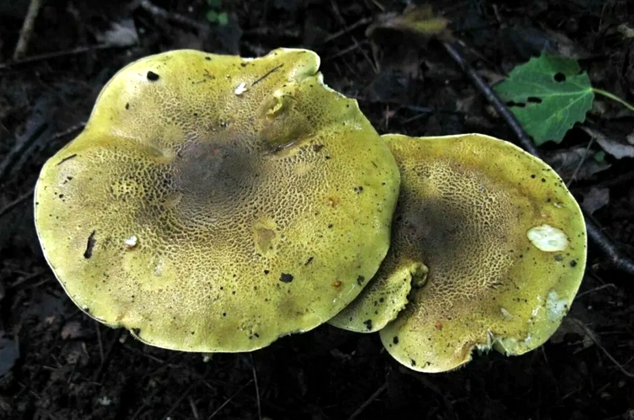 Шляпка: Это, пожалуй, самая заметная часть зеленушки. Она имеет диаметр от 5 до 15 сантиметров, а иногда может достигать и 20 см. Форма шляпки меняется с возрастом: у молодых грибов она выпуклая, почти шаровидная, но по мере роста становится более плоской, иногда с небольшим углублением в центре. Цвет шляпки варьируется от лимонно-желтого до зеленовато-желтого, иногда с оливковыми или бурыми пятнами, особенно в центре. Поверхность шляпки гладкая, сухая, иногда слегка клейкая во влажную погоду. Края шляпки у молодых грибов подвернуты вниз, а у зрелых – прямые или слегка волнистые.